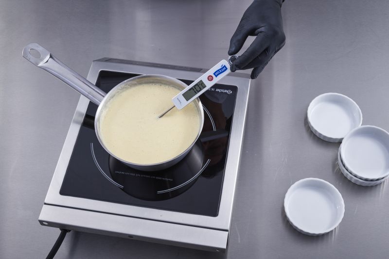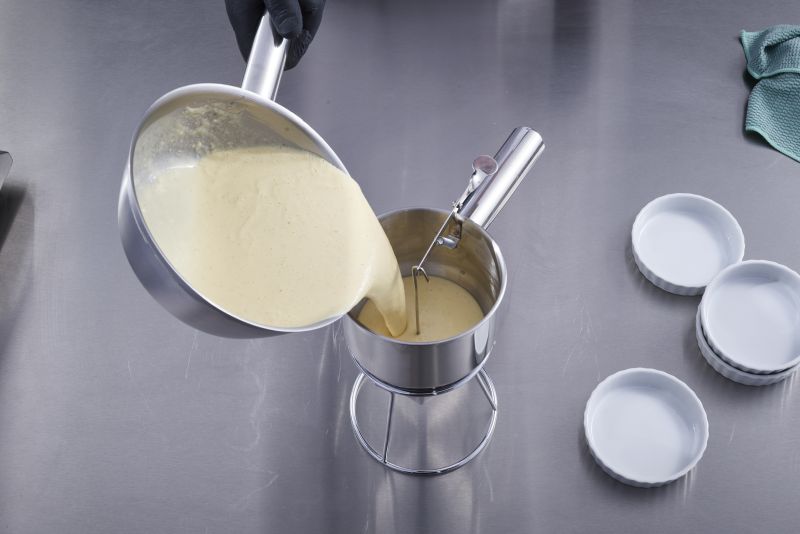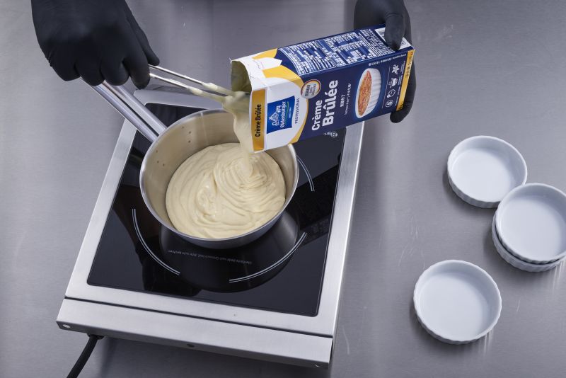 Đổ hộp Crème hiệu Brûlée Oldenburger vào chảo nấu.