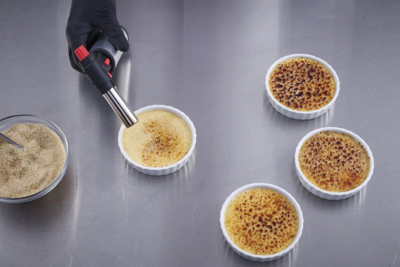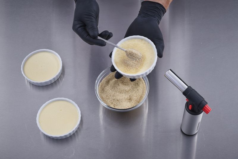 Sử dụng bình khò chuyên nghiệp để tạo lớp caramel trên bề mặt.